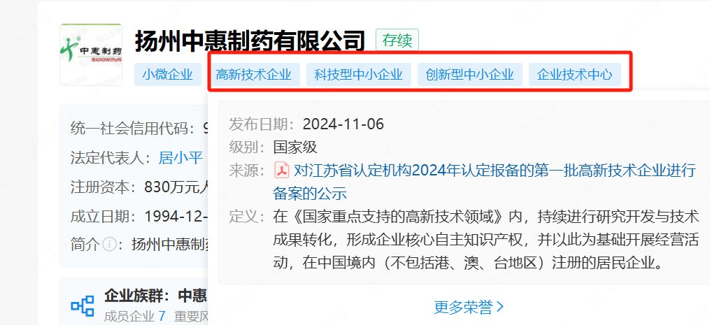 揚州中惠制藥有限公司又獲“專精特新”榮譽